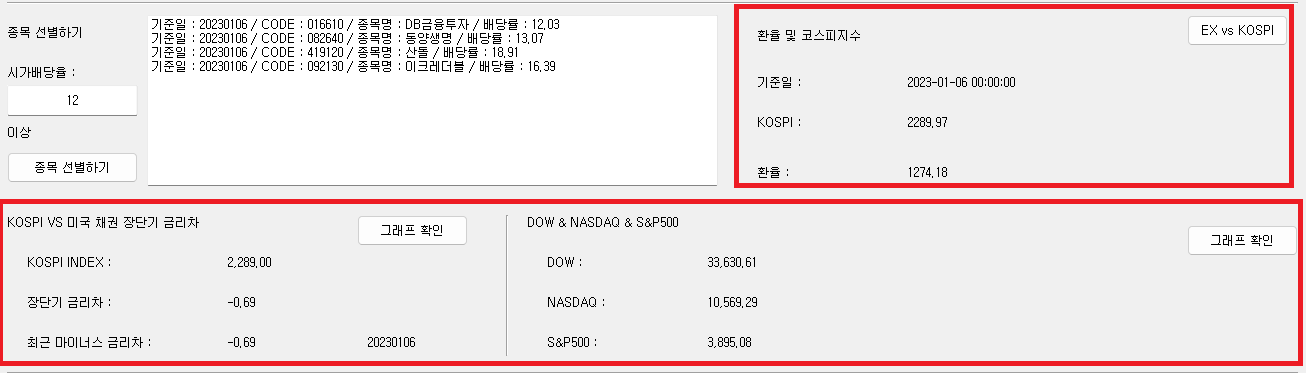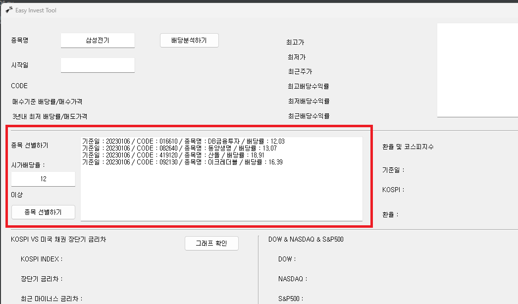 위의 빨간색 박스에서 원하는 "시가배당률"을 입력하고 "종목 선별하기" 버튼을 누르면 종목을 선별할 수 있습니다.