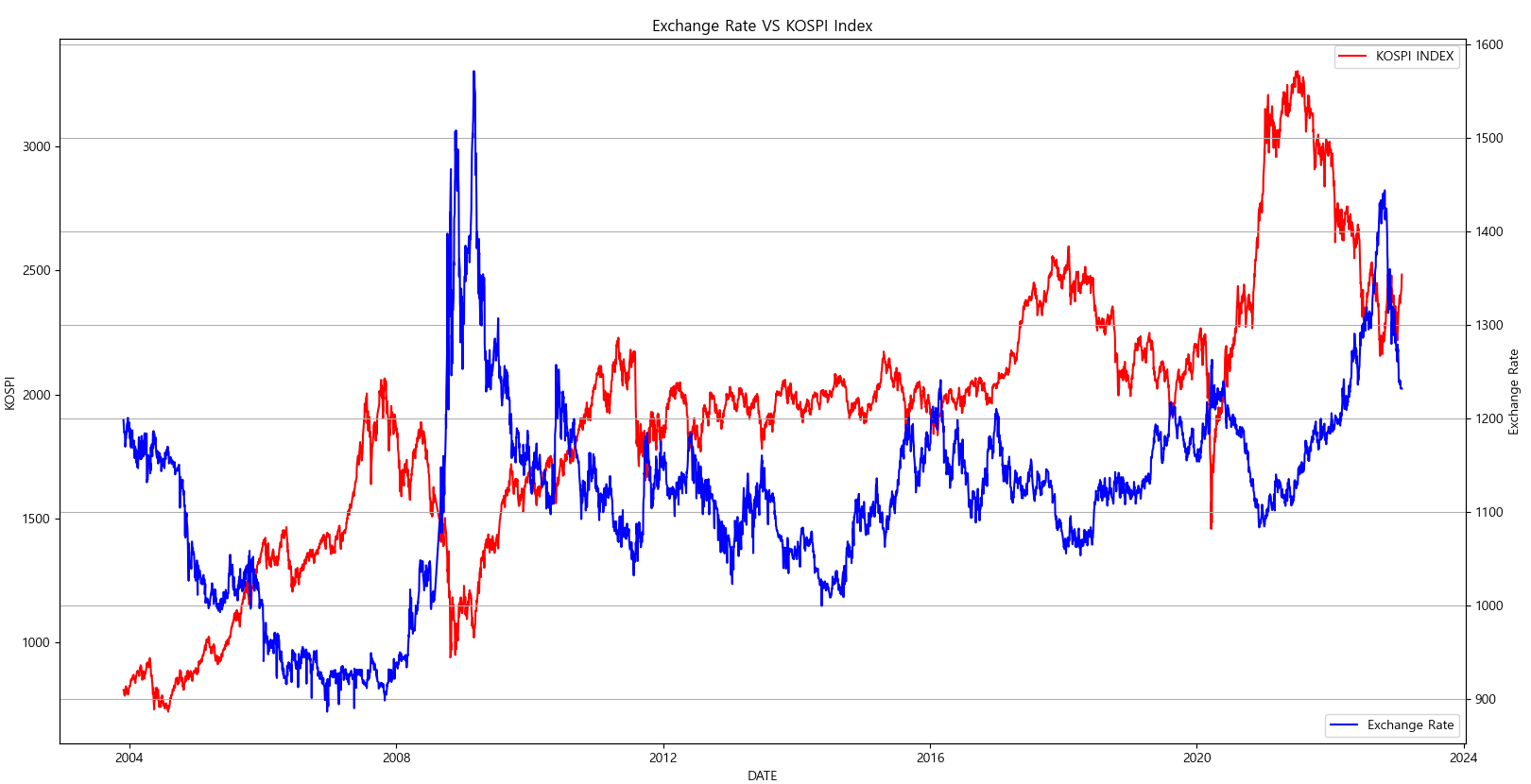 또 하나 재미있는 점은 우리나라 KOSPI는 환율과 반대로 움직이고 있습니다.