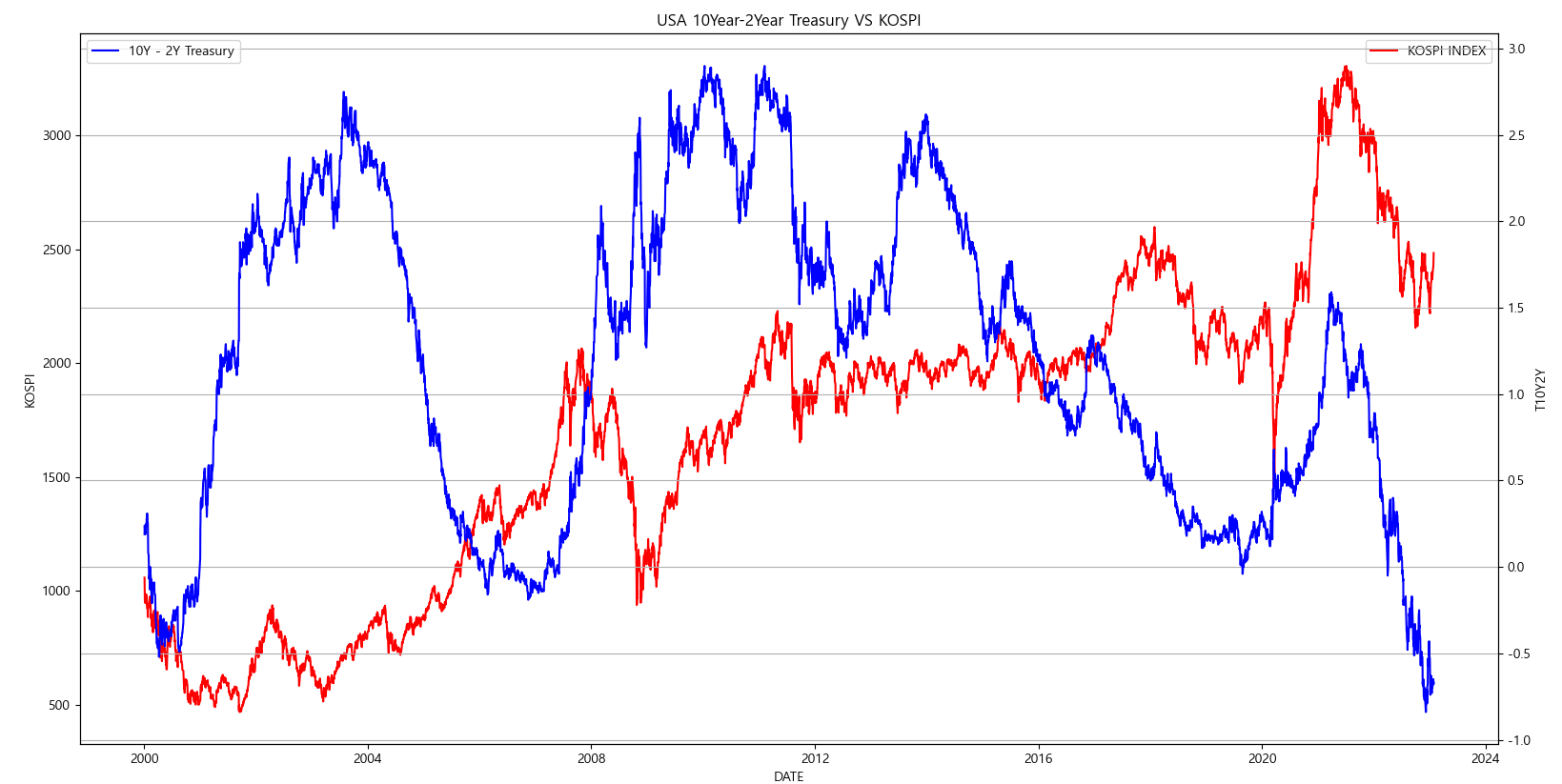 미국채 장단기 금리차가 역전되면 폭락장이 온다는 사실을 어설프게 알게 된 후로 틈틈히 코스피와 비교한 그래프를 보고 있습니다.