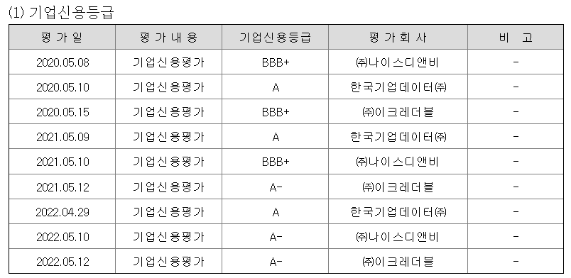 그게 반영되어서인지 2022년에는 신용등급이 A-까지 상향되었습니다.