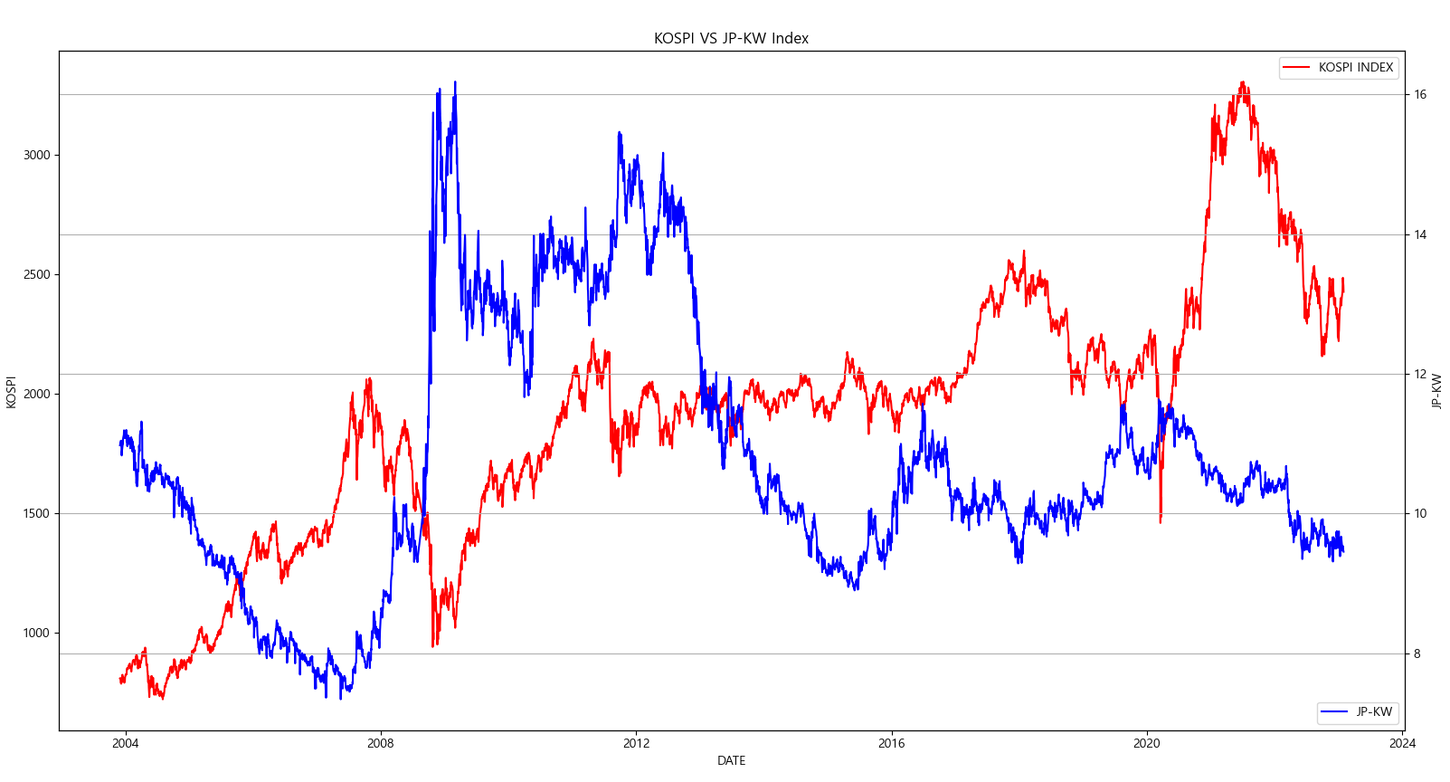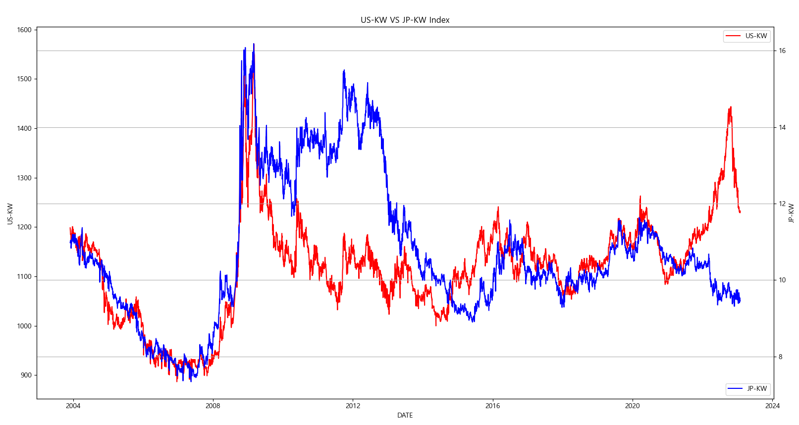 USD-JPY와 JPY-KRW 환율을 비교하니 재미있는 결과가 나왔네요.