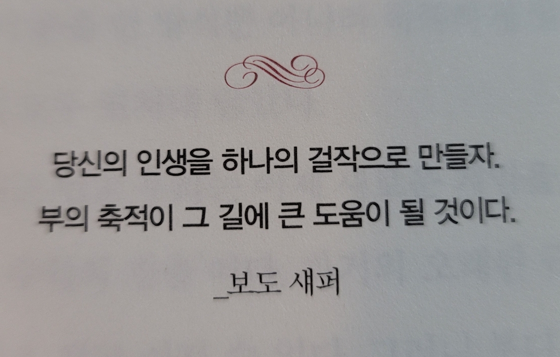 - 우선 일상생활에서 최소한의 소비를 하며 절약하고 자신이 어떻게 살고 싶은지부터 배워야 한다. 이것이 부자가 되는 법이다.