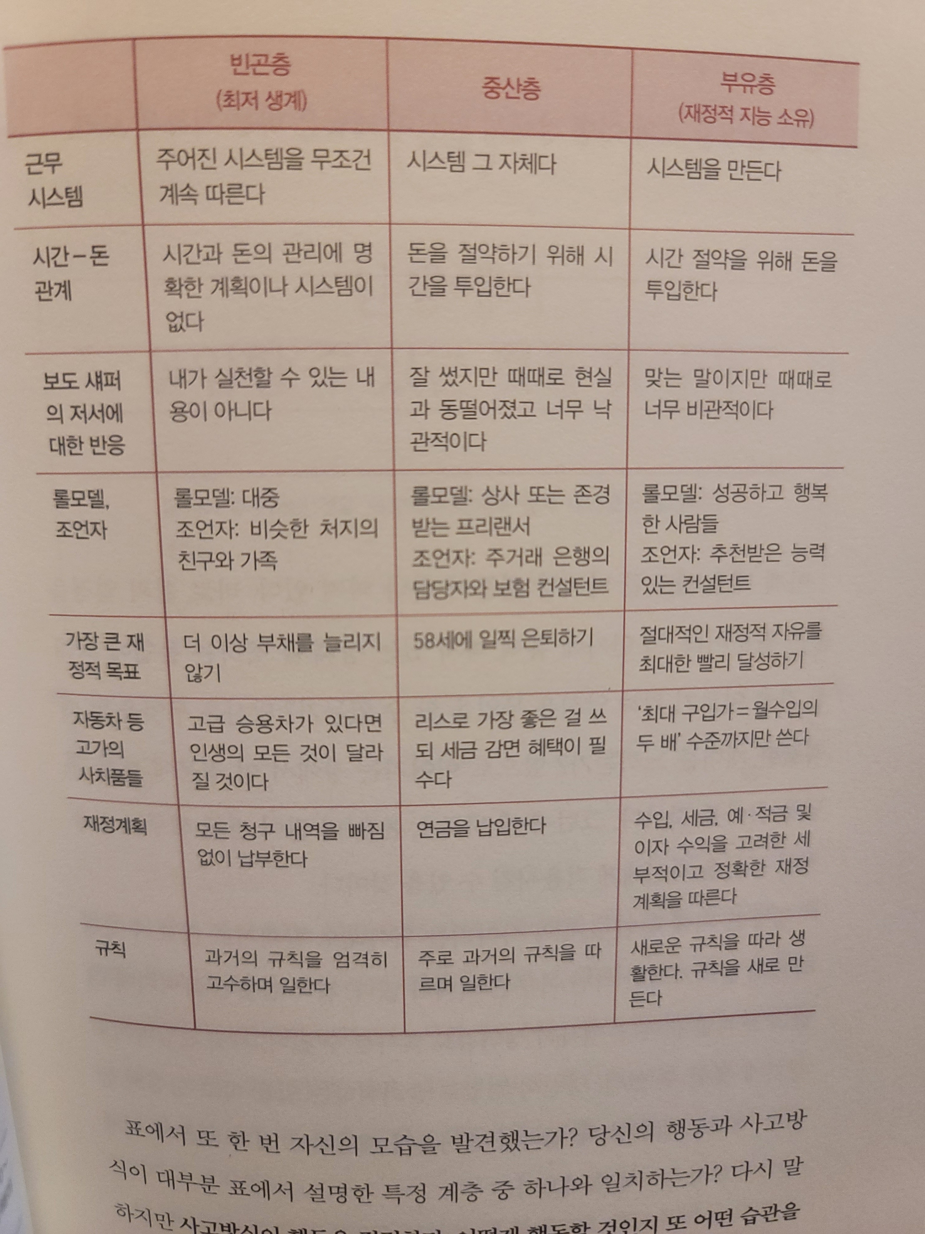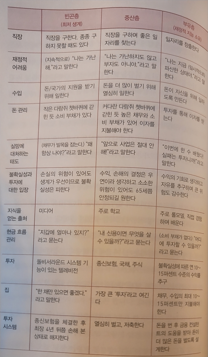 - 빈곤층, 중산층, 부유층을 돈과 수입, 성과와 업무, 새로운 규칙과 과거의 규칙에 대한 태도, 꿈과 목표가 있는 인생에 대한 기대로 나눠보면 사고 유사성, 행동습관이 놀랄정도로 높다.