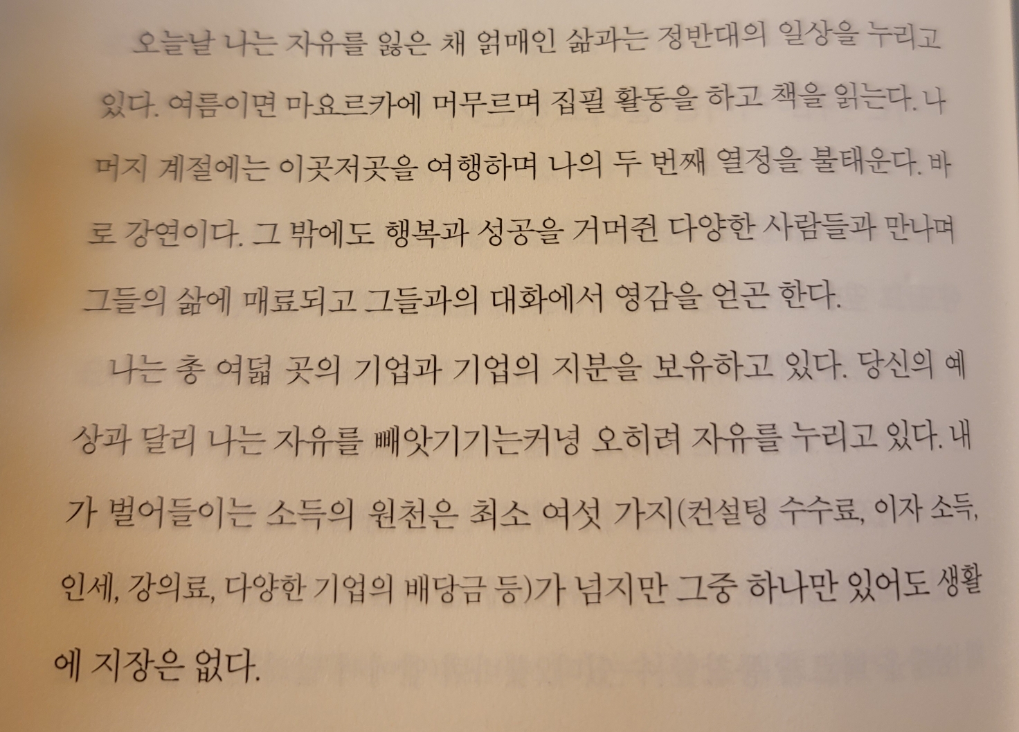 - 위험을 감수하라. 실수를 두려워하지 마라. 부업에 문제가 생겨도 생계의 위협을 받을 일은 없다. 당신에게는 본업이라는 안전망이 있다. 오히려 부업을 통해 위험에 대비하는 훈련을 할 수 있다.