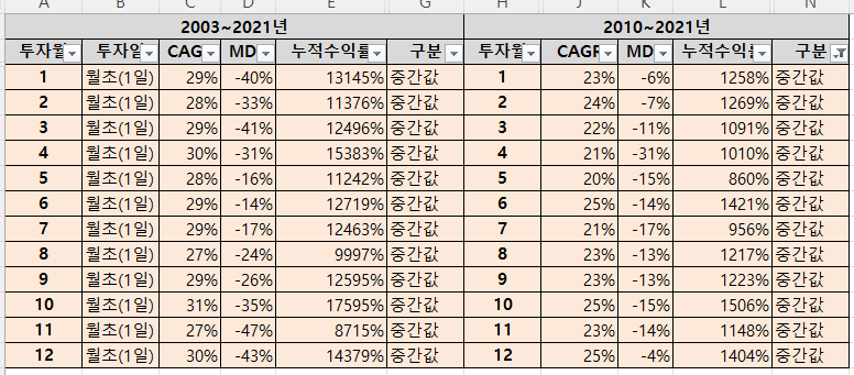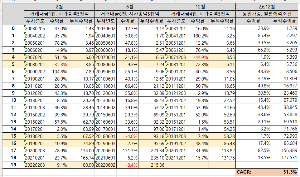 월(12개월) x 시가총액(5백억~3천억, 6가지) x 거래대금(0~1억이상, 11가지) X 기간별(2003년부터, 2010년부터) CASE로 수익률을 확인해봤다.1,584가지의 경우의 수이다.