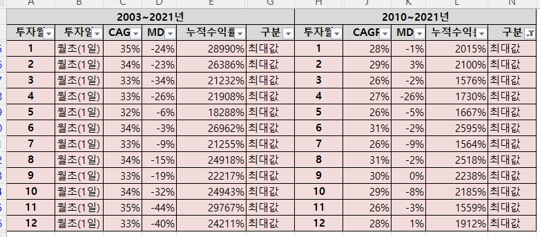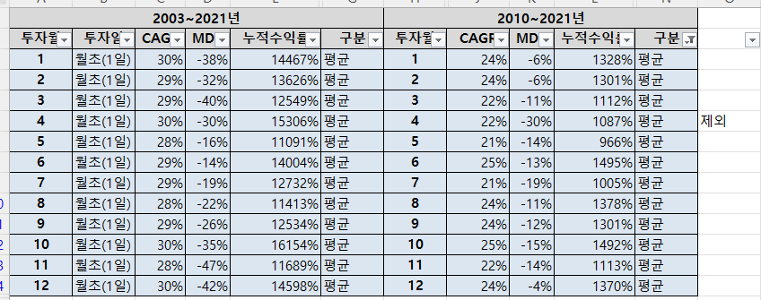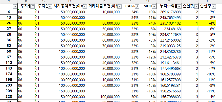 각 월별로 최적의 투자 Filtering 조건은 "최적조건찾기" 엑셀파일에서 CAGR이 높고, MDD가 낮고, 손실횟수가 적은 것 위주로 입력했다.