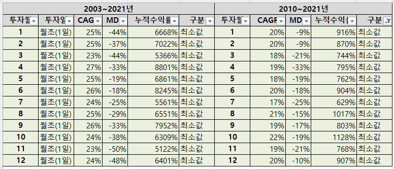2003년부터와 2010년부터를 나눈 이유는 2008년 금융위기시 폭락장이 너무 커서 혹시나 왜곡의 가능성이 있지 않을까 생각했다. 그래서 2010년부터의 데이터를 별도로 만들었다.