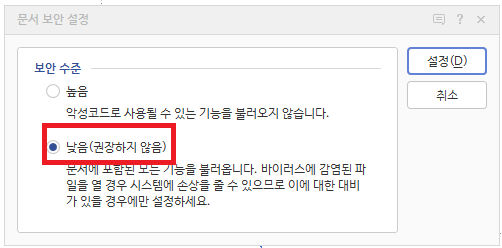 "문서 보안 설정"에서 보안수준을 "낮음"으로 설정해 줍니다.