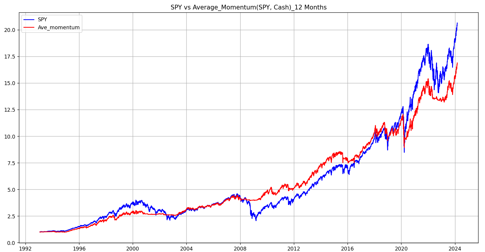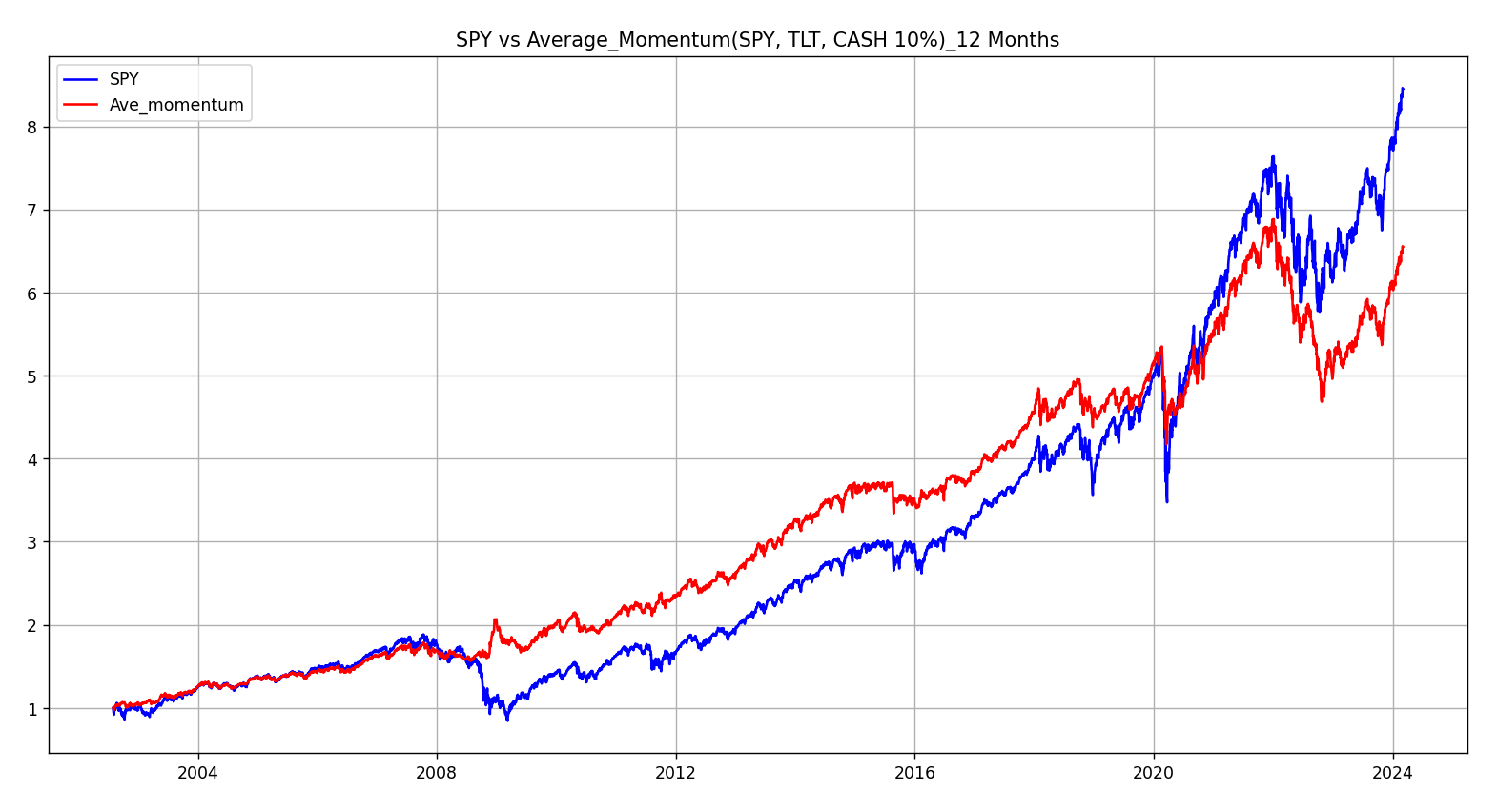 SPY와 현금을 평균모멘텀스코어를 통해 비중을 조절하면서 투자하는 것이 합리적이겠네요.