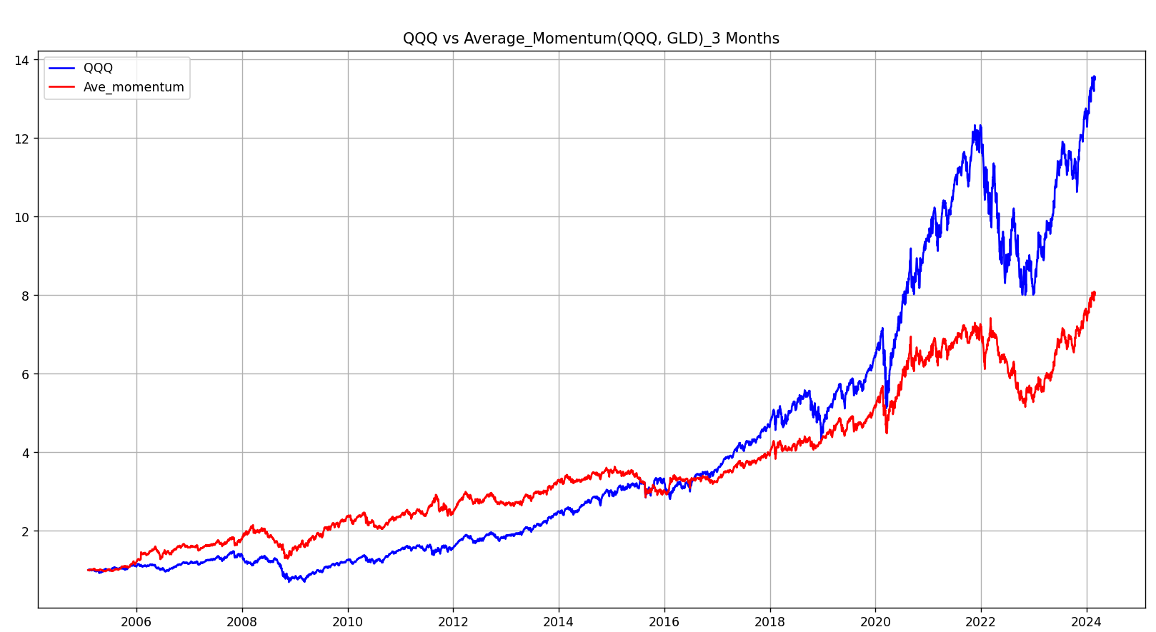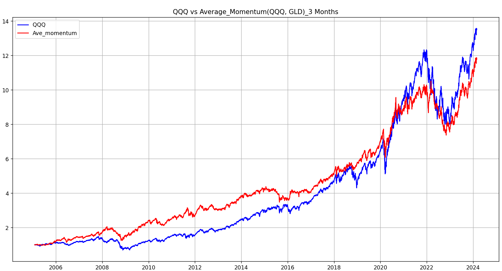 자산은 QQQ와 GLD를 평균모멘텀스코어라는 방법을 통해 동적자산분배를 매월 리밸런싱을 통해 진행할 예정입니다. 백테스트 기간은 2005년 1월 2일부터 2024년 2월 29일까지 입니다.