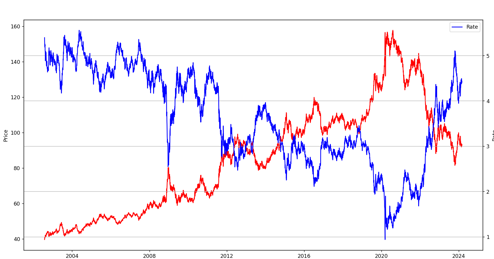 ax2.plot(df.index, df['금리'], color='blue', label='Rate')