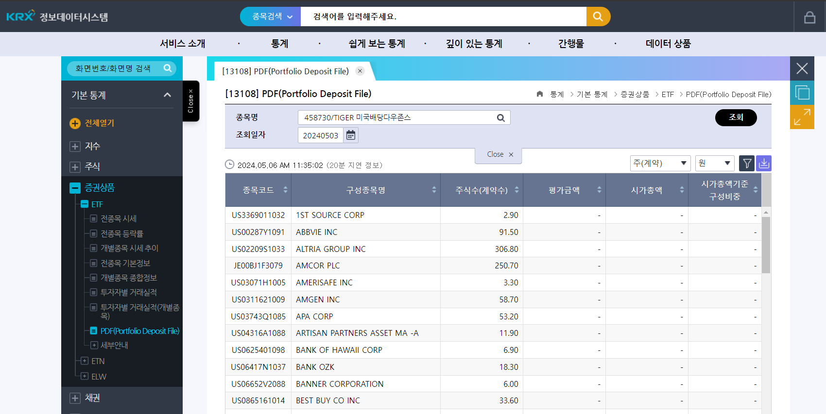 KRX 홈페이지 -> (상단메뉴의) 정보 데이터 시스템 -> (왼쪽 메뉴의) 증권상품 -> ETF -> PDF(Portfolio Deposit File)