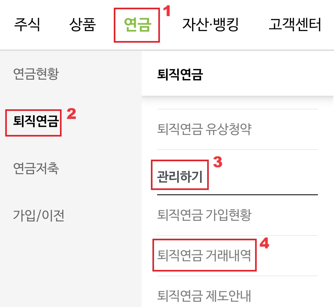 메뉴 상단에 '연금' >> '퇴직연금' >> '퇴직금 거래내역'을 차래로 눌러줍니다.
