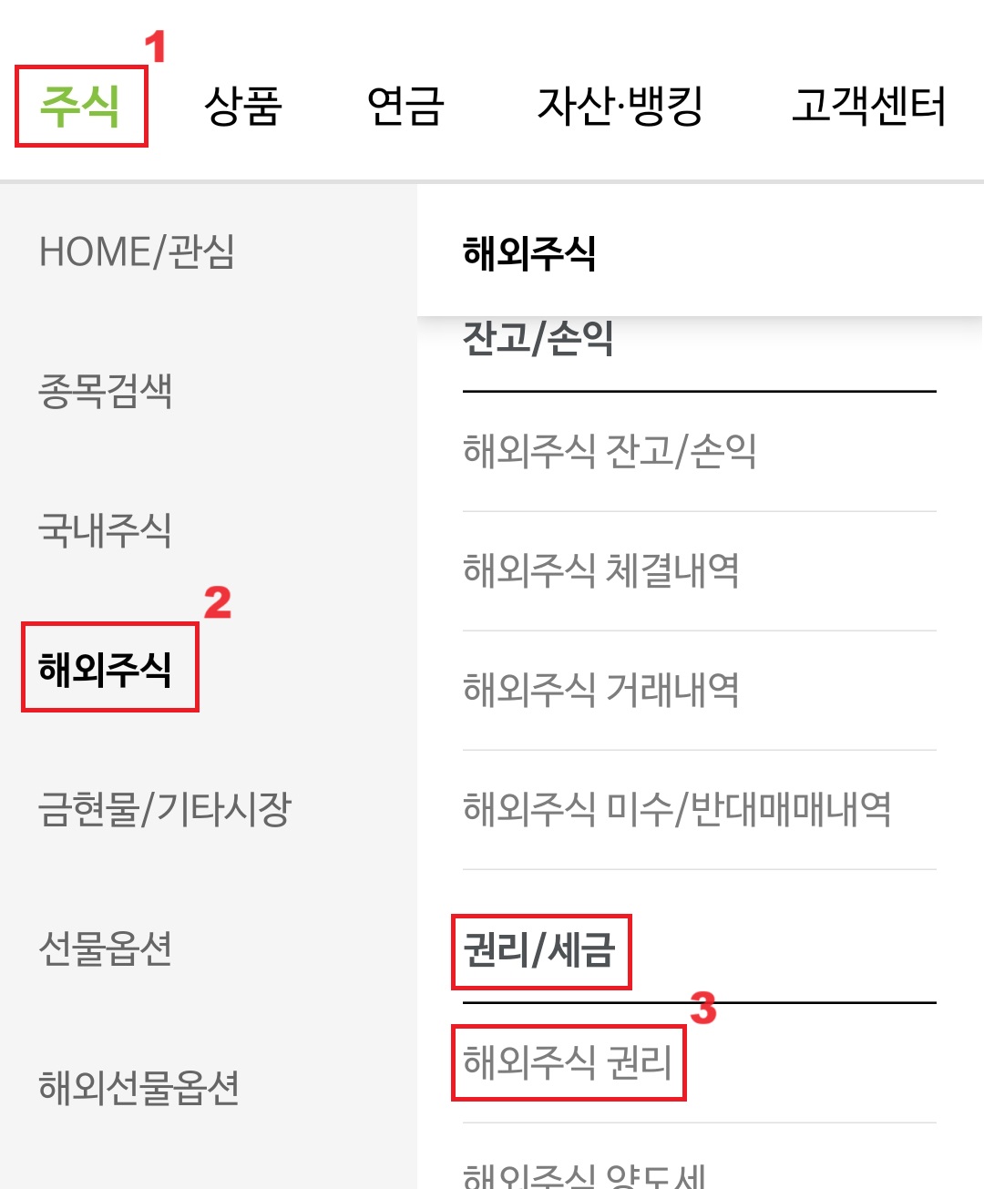 메뉴페이지에서 "주식" >> "해외주식" >> "권리/세금" >> "해외주식 권리" 로 차례대로 선택합니다.
