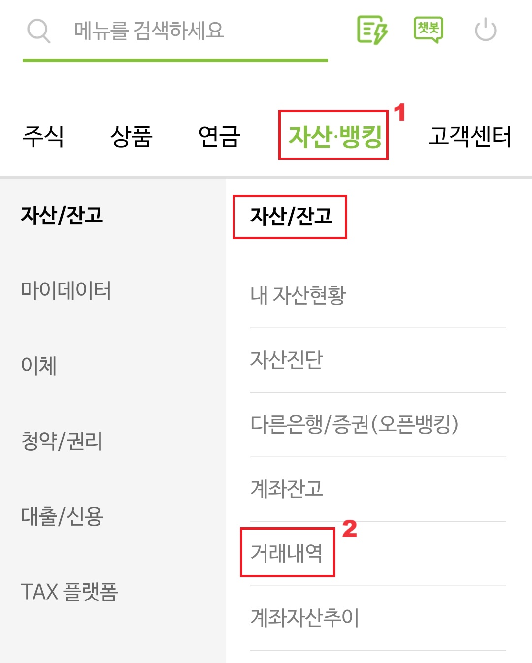 메뉴 페이지에서 상단에 "자산뱅킹"을 선택하고 "자산잔고" 그룹에서 "거래내역"을 선택하면 됩니다.