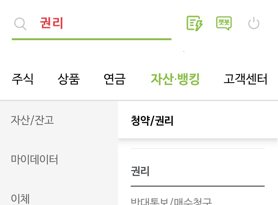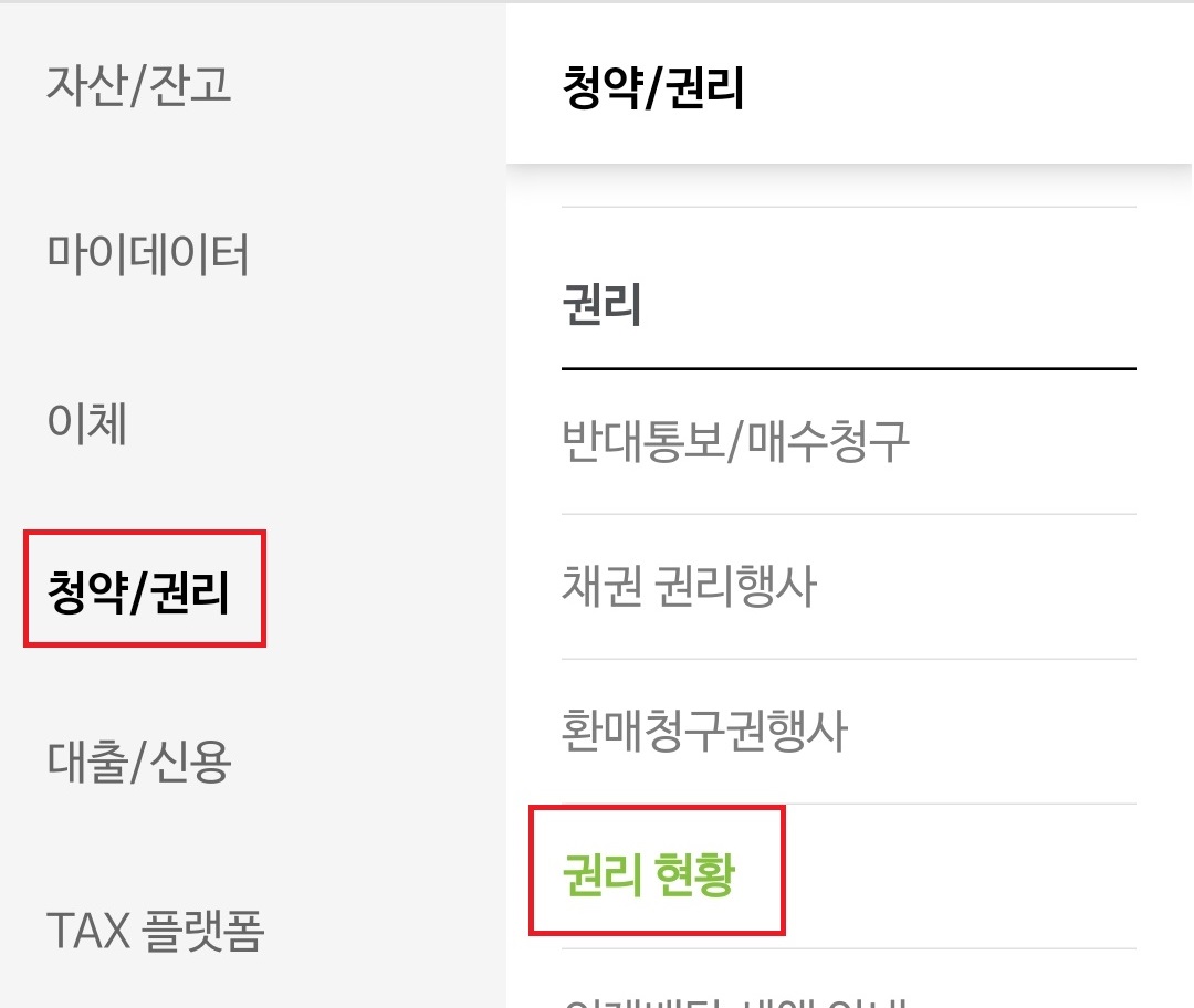 왼쪽 메뉴에서 "청약/권리"를 선택한 다음 "권리" 그룹에서 "권리현황"을 선택하시면 됩니다.