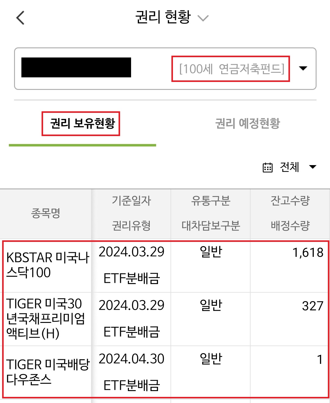 상단 메뉴에서 상품권리를 누르면 배당이 들어온 내역을 확인할 수 있습니다.