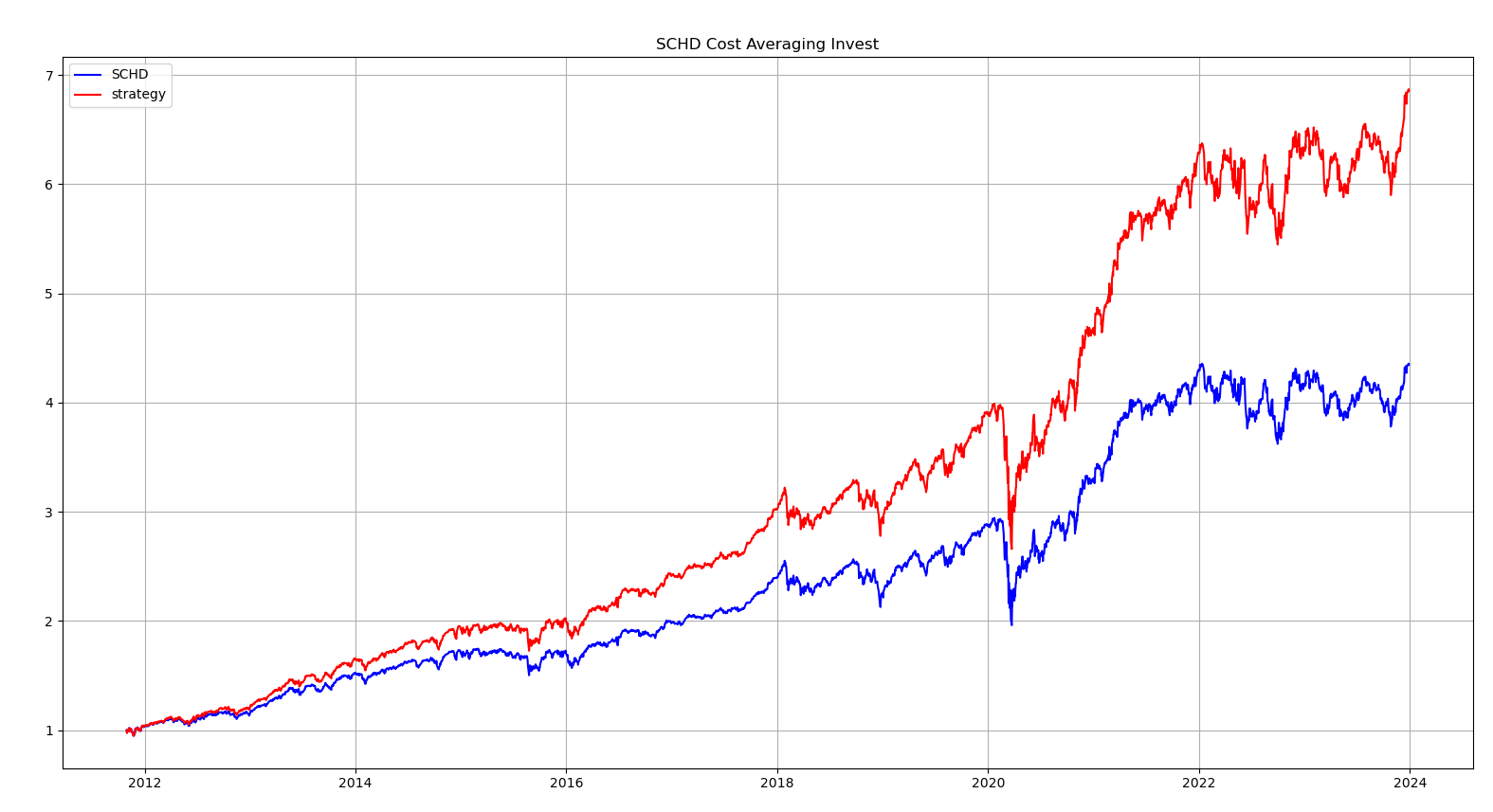 파이썬으로 프로그램을 만들어서 백테스트를 해 보니 SCHD가 연복리 수익률인 CAGR이 약 13%정도 되었습니다.