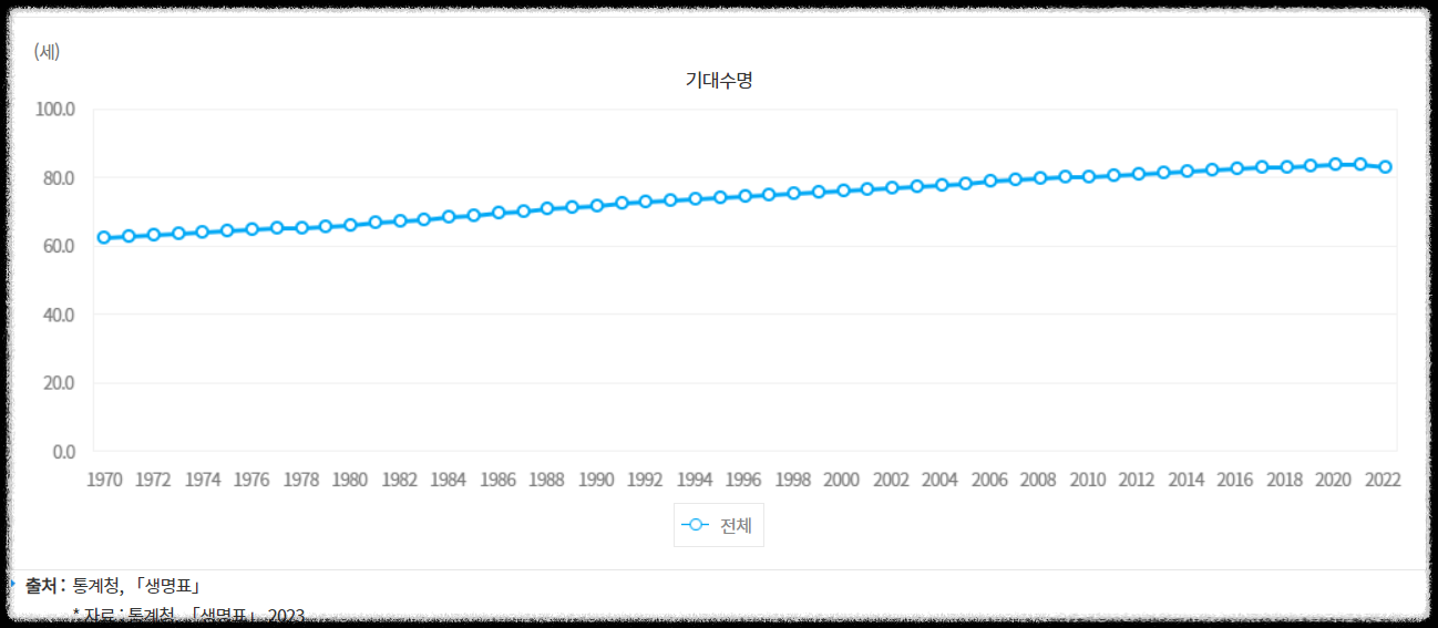 대한민국 인구의 기대 수명은 1970년 62.3세에서 2022년 82.7세로 20년이 늘어났습니다.