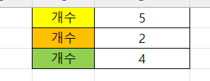 11개의 셀 중에서 노란색, 오렌지색, 녹색의 개수를 세는 VBA 코드를 만들어 보겠습니다.