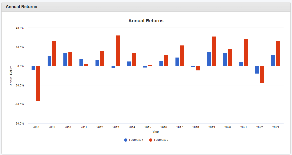 QQQ 또한 MDD가 -35%입니다. 주식이 500개에서 100개로 줄었어도 확실히 위험을 분산하는 효과가 있다는 사실을 확인할 수 있습니다.