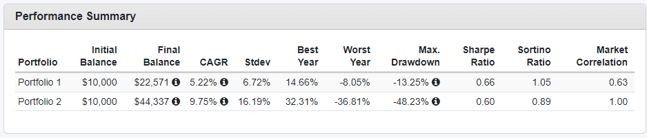 당연히 MDD는 48%에서 13% 로 거의 1/4가량 낮아져서 확실히 변동성이 줄어드는 것은 확인할 수 있습니다.