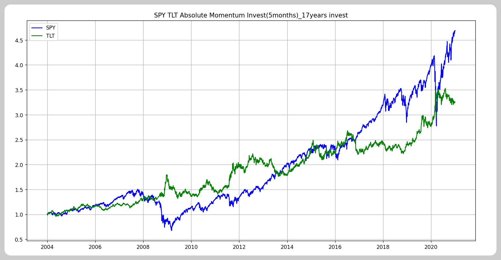 SPY는 S&P500을 추종하는 ETF이고, TLT는 미국 장기채권을 담고있는 ETF입니다.
