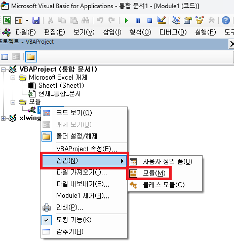 마우스 왼쪽 버튼을 클릭해서 삽입(N) >> 모듈을 선택해 줍니다.