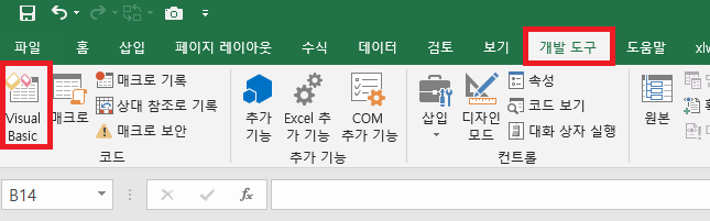 엑셀에서 상단 메뉴에서 개발도구 >> Visual Basic 메뉴로 들어갑니다.