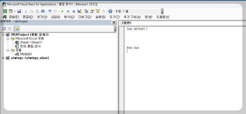위의 그림에서 보인는 Sub sbTest() ~~ End Sub 사이에 코드를 작성하시면 됩니다.