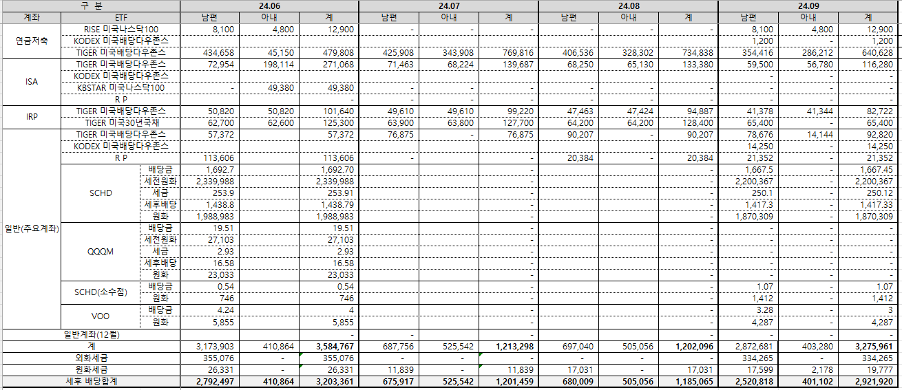 배당이 나오면 재투자를 하고, 추가금도 착실히 넣었는데 6월과 비교해서 9월 배당금은 다소 줄었습니다.