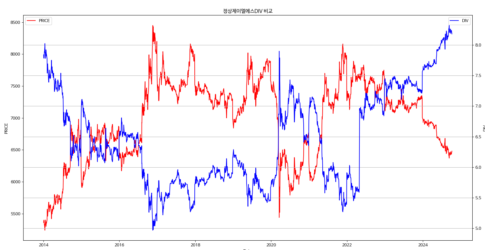 이 회사는 배당이 일정하기 때문에 주가와 배당이 규칙적으로 반대로 움직이는 것을 알 수 있다. 이런 회사는 지금 주가가 낮은지 판단하기 상당히 수월하다.