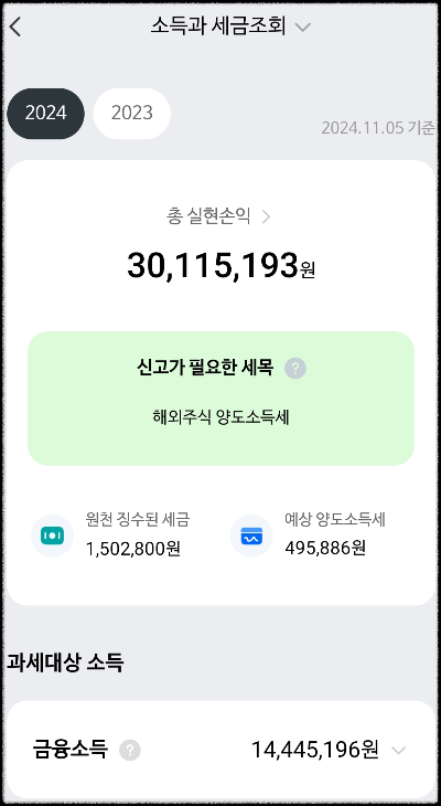 그래서 증권사에서 제공하는 손익과 실현손익 그리고 금융소득을 살펴보았습니다.