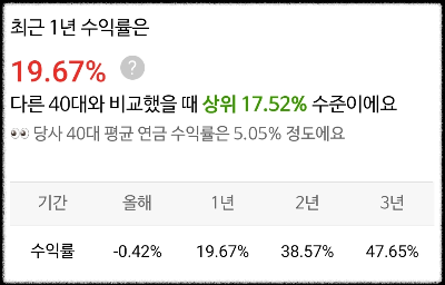 최근 1년 수익률은 19.67%로 다른 40대와 비교해서 상위 17%정도 된다.