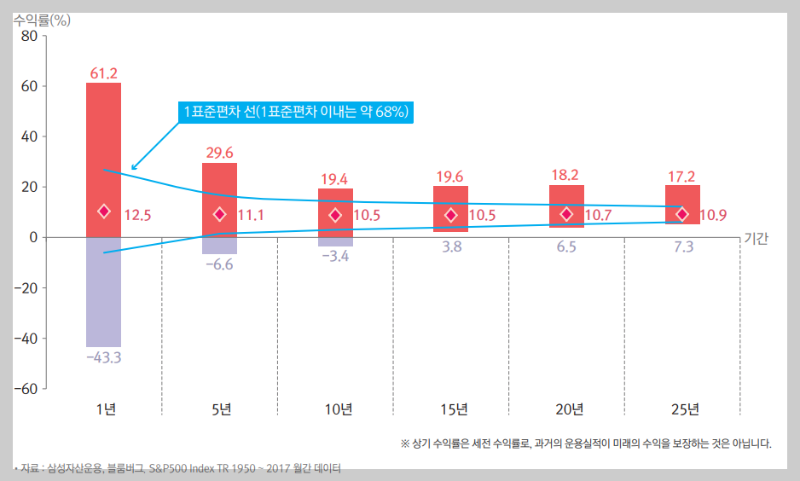 S&P500 인덱스펀드를 1년 보유했다면 손실은 -43.3% 정도 발생한다. 하지만 15년 이상 보유하면 손실 확률은 0%가 된다.