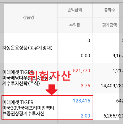 -15% 이상 손실을 본 상품이 과연 안전한가? 반면에 TIGER 미래에셋 미국배당다우존스 ETF는 위험자산으로 분류되었지만 약 30%의 수익을 보고 있다.