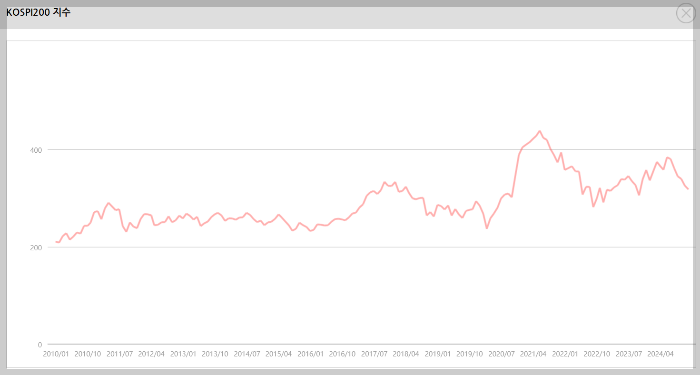 하지만 KOSPI 200의 경우 10년동안 208에서 317로 겨우 1.5배 상승에 그쳤다.