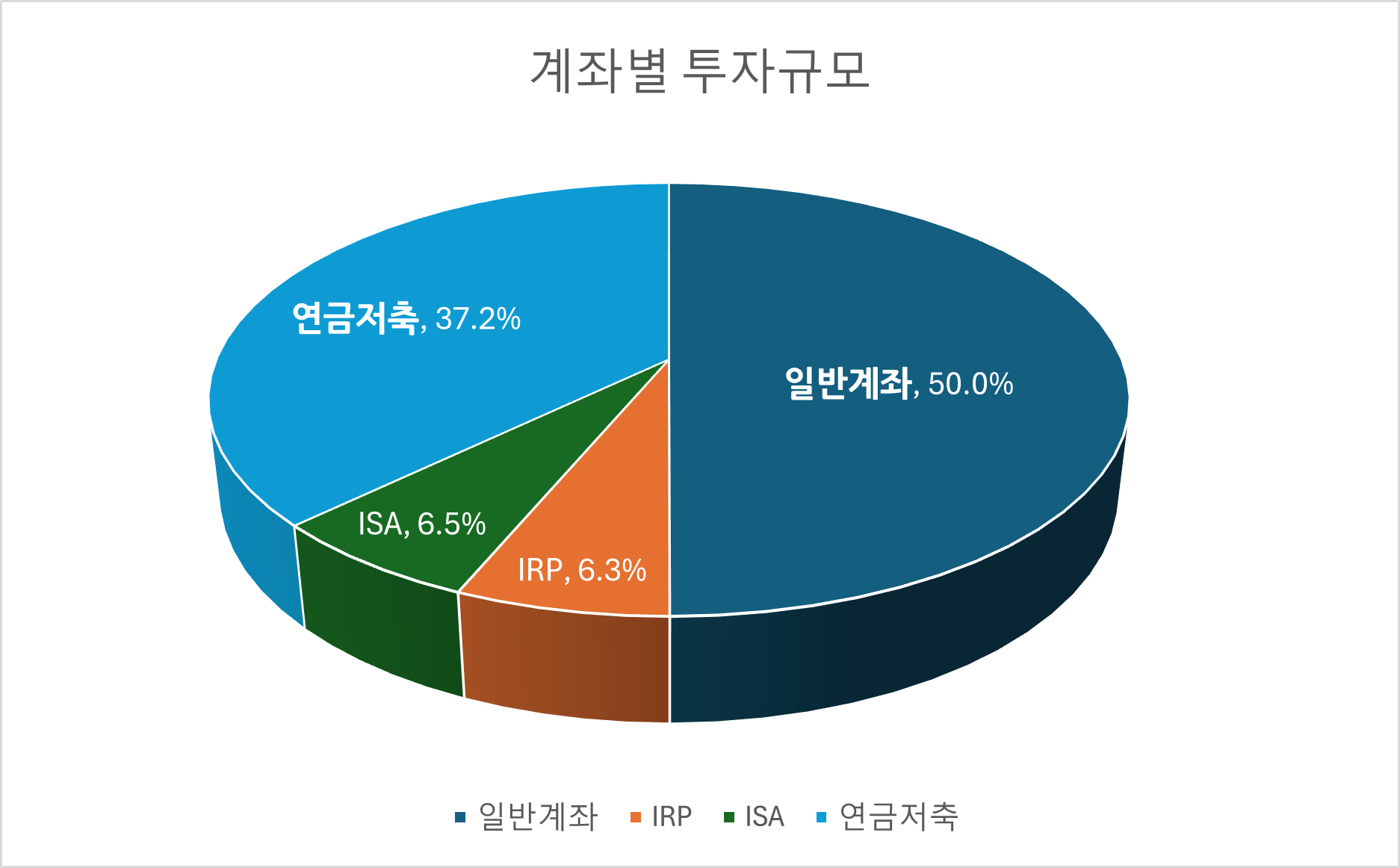 계좌별 투자규모를 보게되면 연금저축, IRP, ISA가 전체 투자금의 50%를 차지한다.