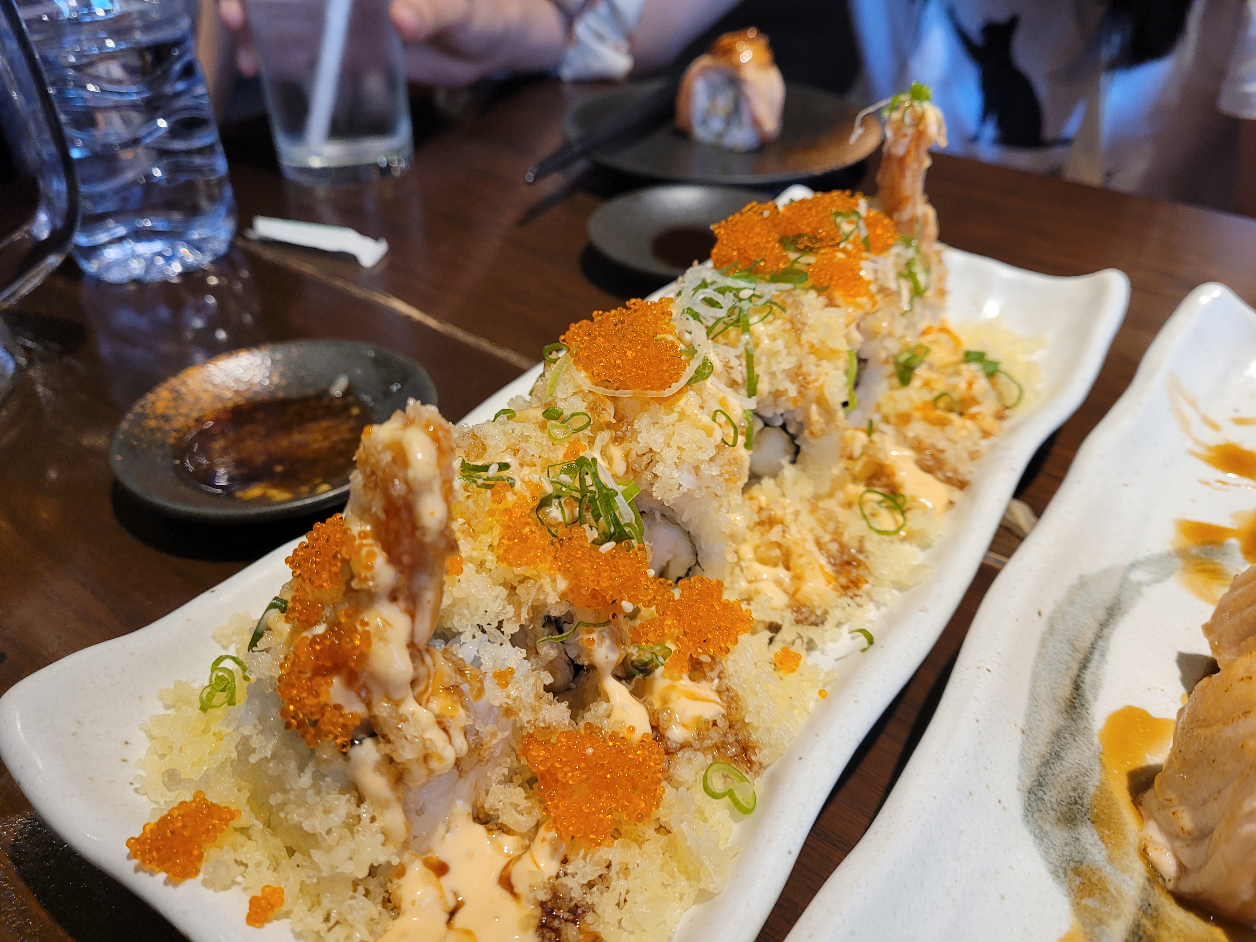 스시롤 위에 바삭한 튀김이 뿌려진 음식이다.