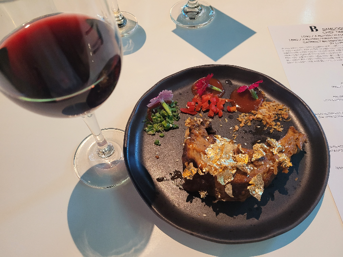 잘 익혀진 소고기 위해 소스와 함께 금장식이 되어 있다.