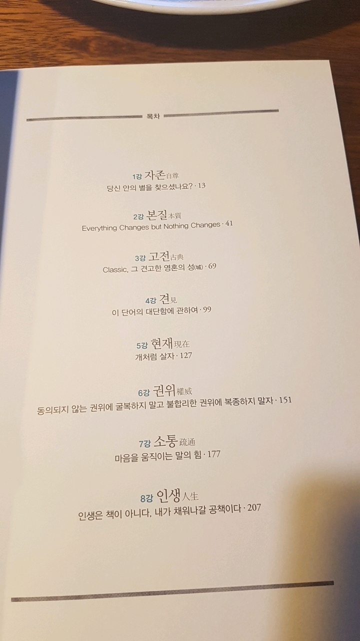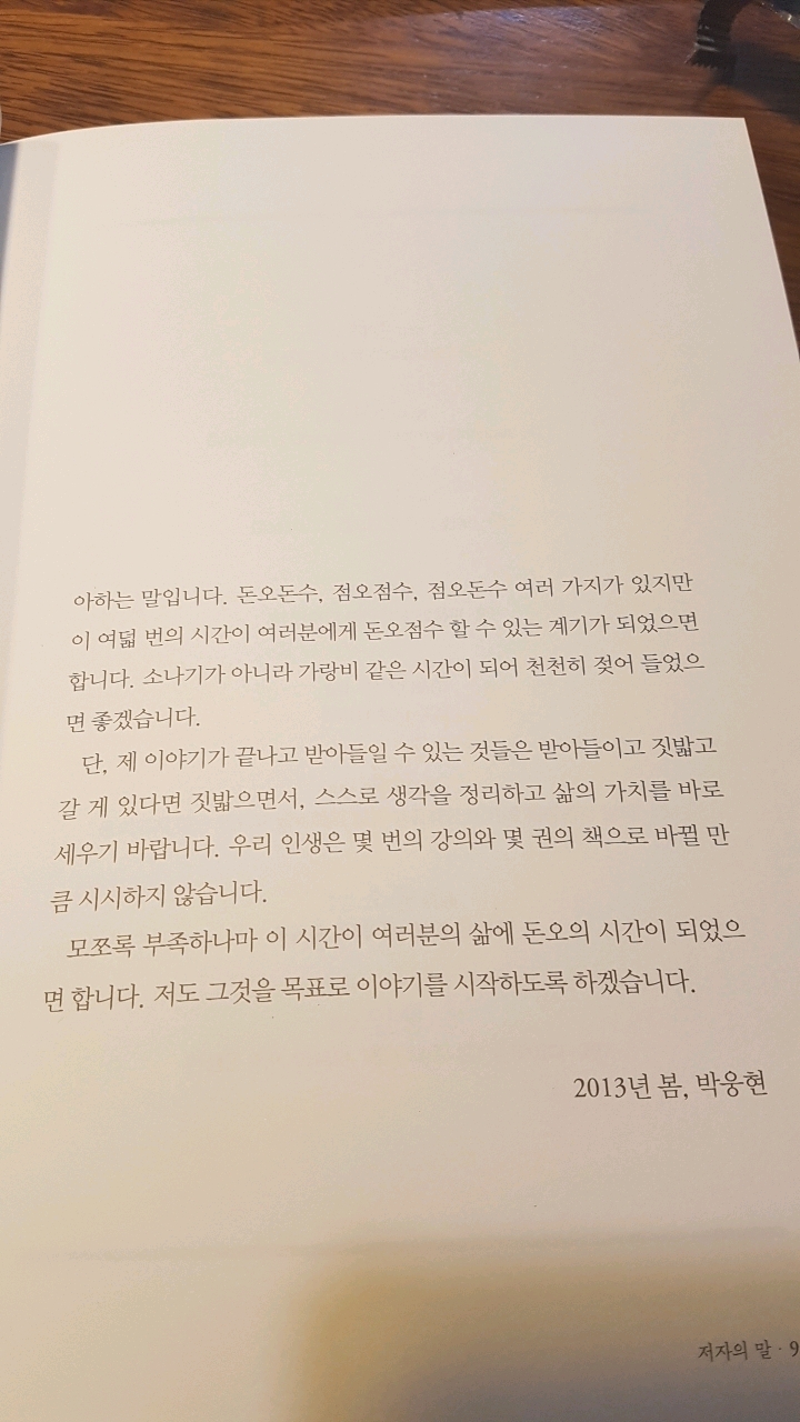 "귀 기울여 주시되 큰 기대는 하지 않길 바랍니다. 인생은 강의 몇 번, 책 몇 권으로 변하지 않으니까요. 만약 강의 몇 번으로 여러분의 인생을 정리해주겠다는 사람이 있다면 의심해봐야 합니다."