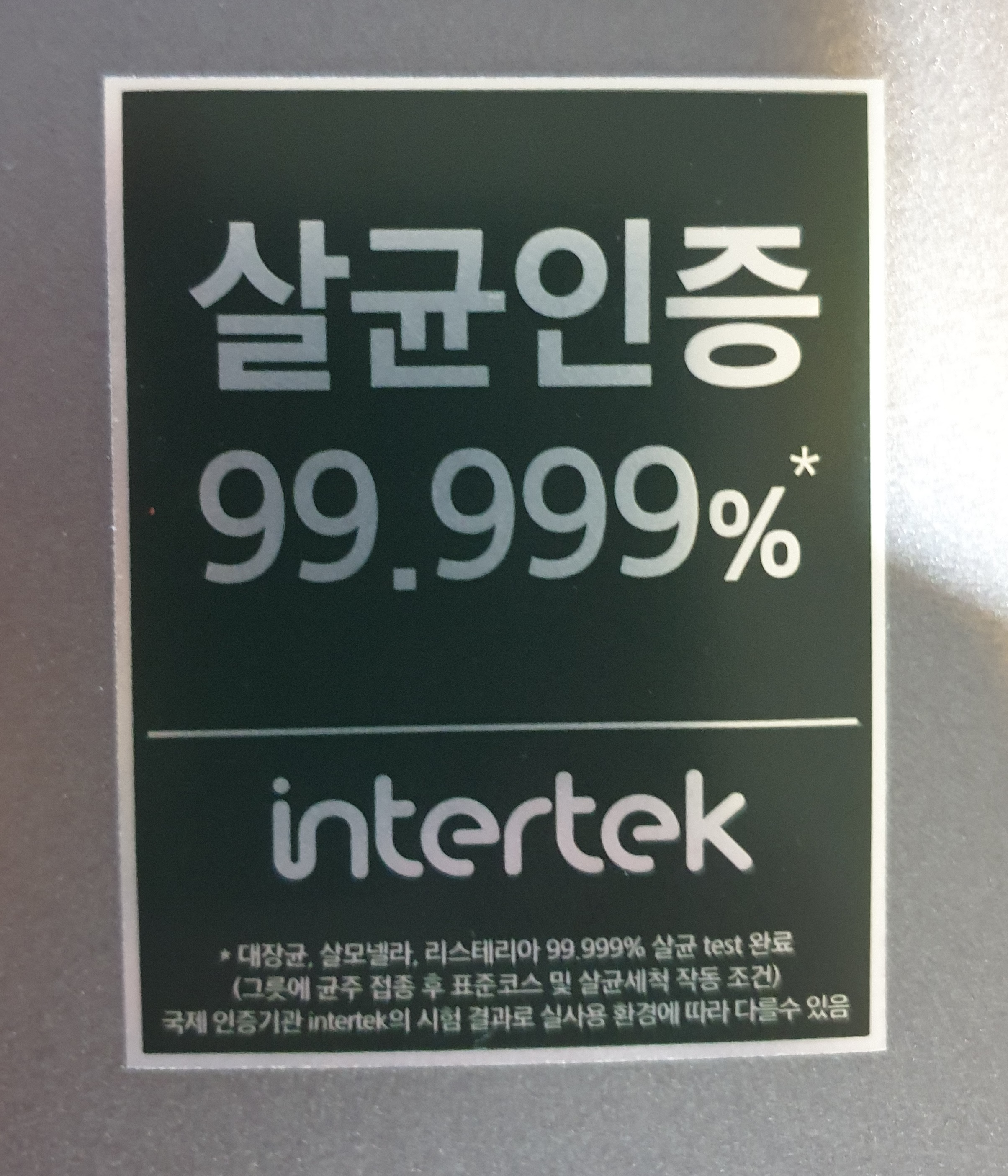 살균하는 균은 대장균, 살모넬라균, 리스테리아균, 로타바이러스, 노로바이르서, A형 간염 바이러스, 코로나 바이러스... 등등 많은대요. 이 부분도 둘다 살균이 충분히 잘 된다니 비교가 필요없을 것 같습니다. 다만 삼성은 국제 인증기관 intertek에 인증을 받았더라구요.