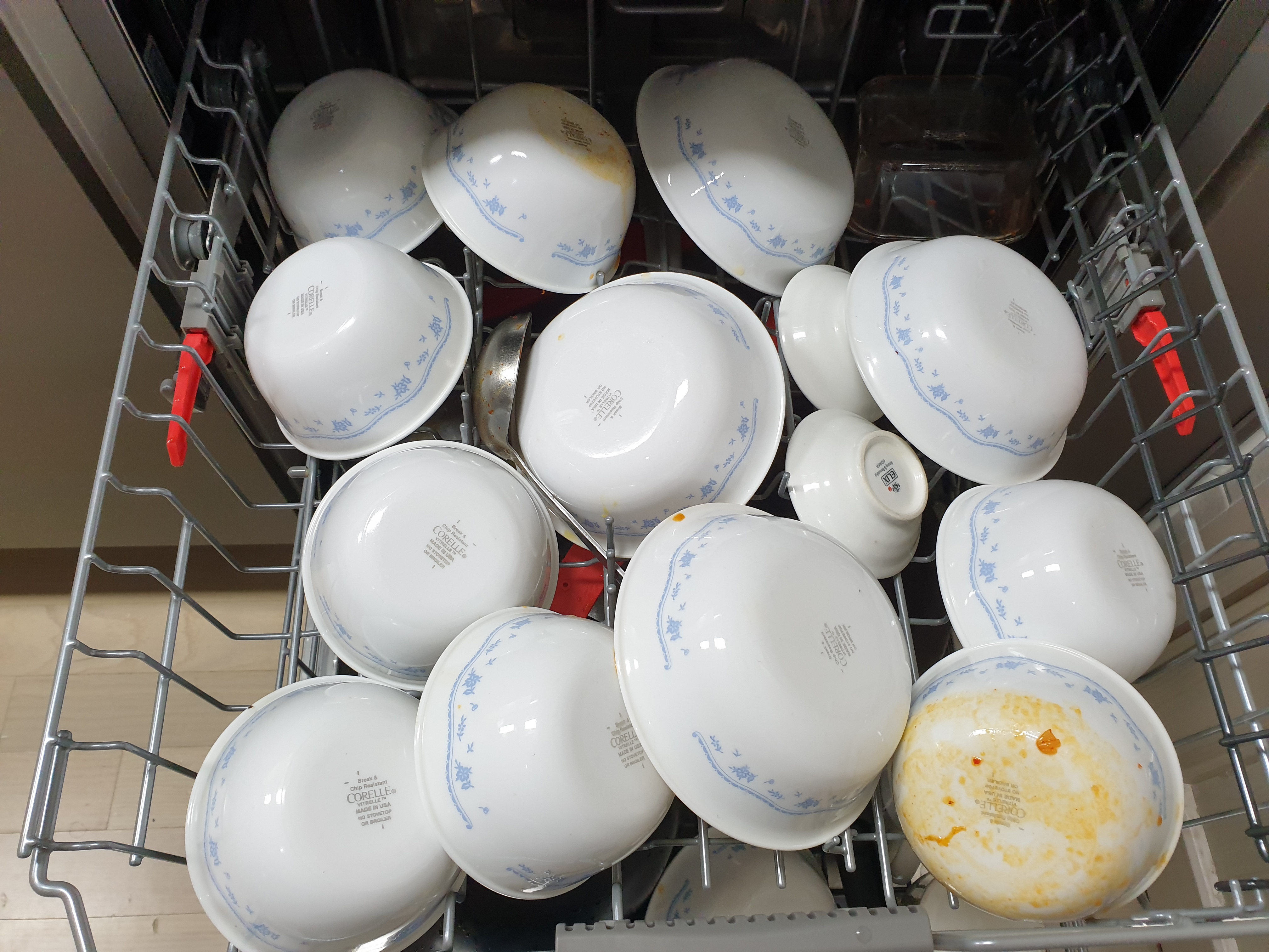 예비세척 없이 먹고나서 바로 모든 그릇과 냄비와 후라이팬을 식세기에 넣었습니다.