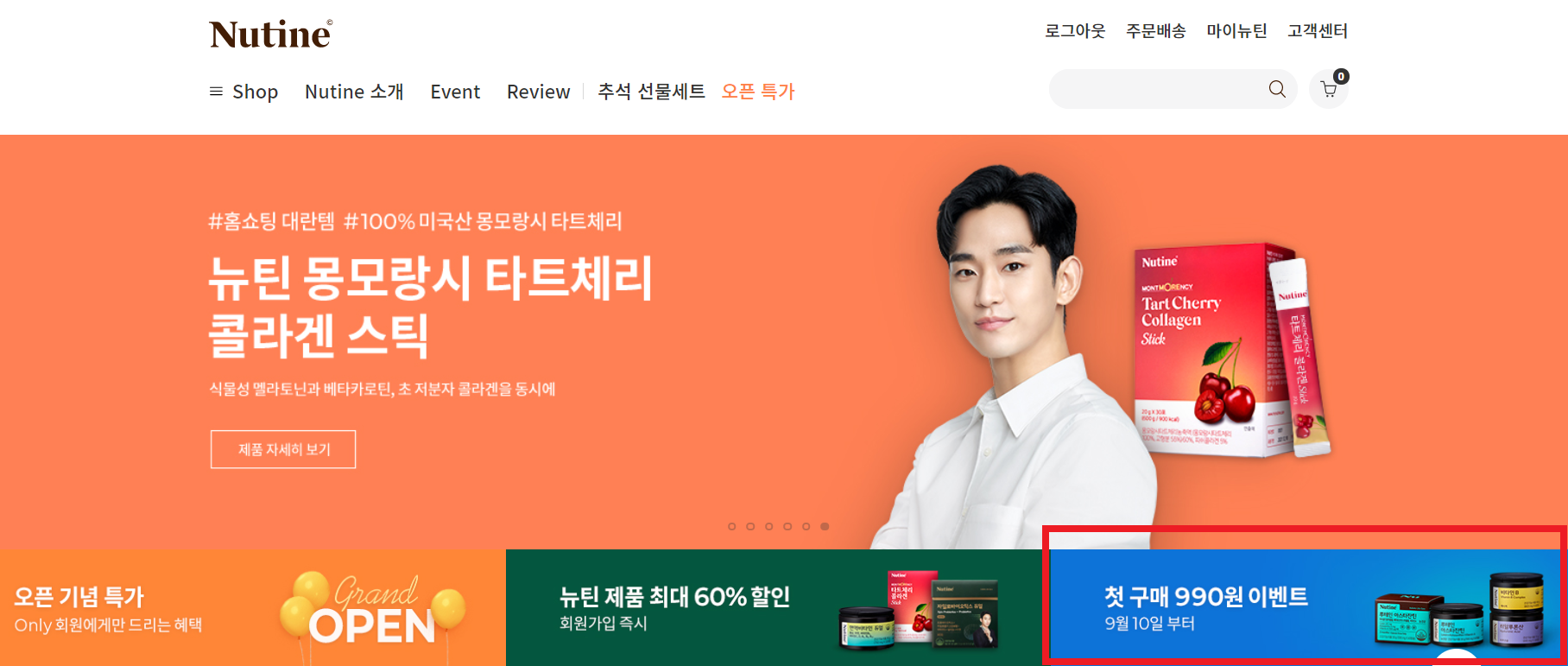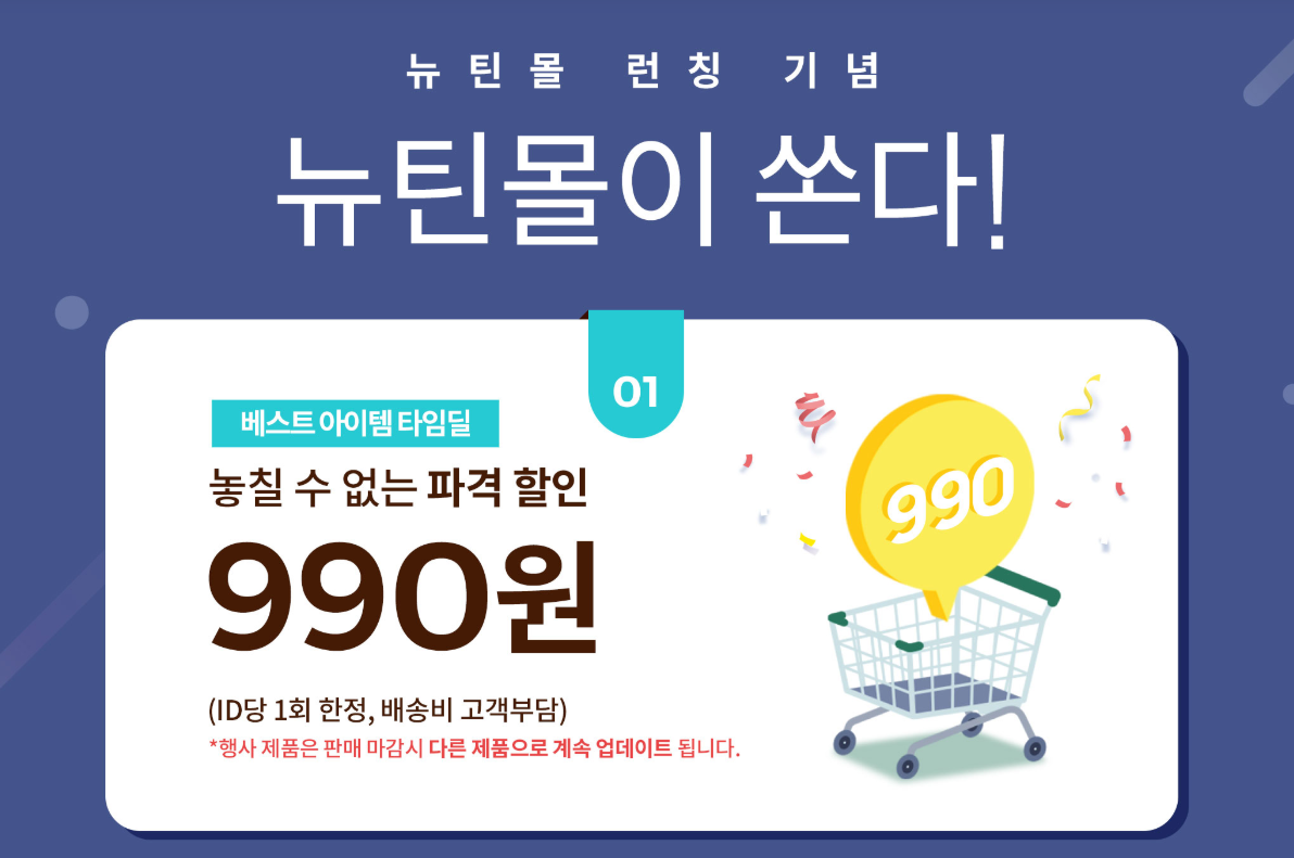 영화배우 김수현씨가 선전하는 뉴틴몰에서 오픈기념 첫구매 비타민B 990원 이벤트를 하고 있네요.