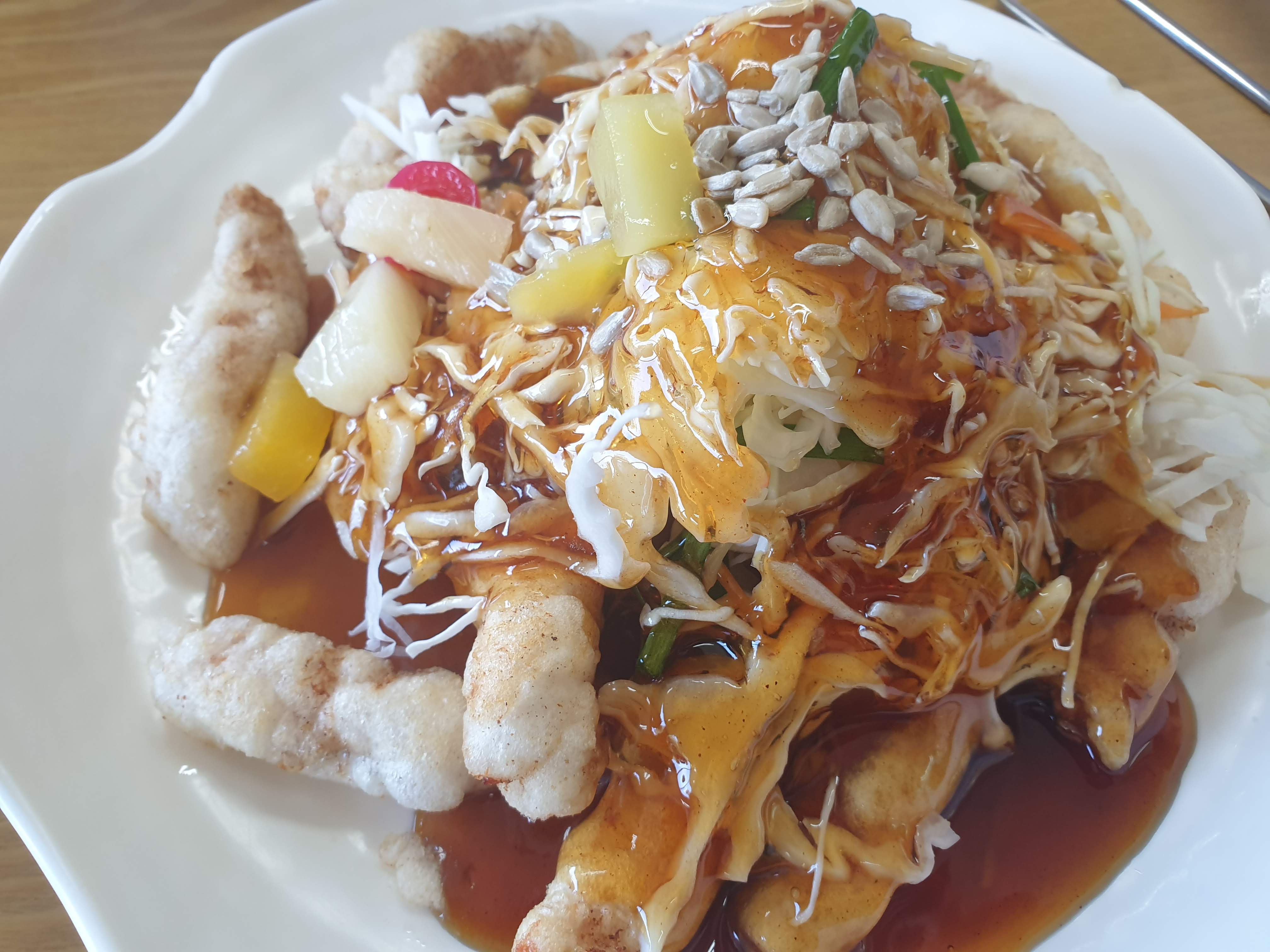 여기 탕수육의 특징은 산처럼 쌓여있는 얇게 채썬 양배추입니다. 뜨거운 탕수소스와 어우러진 양배추는 탕수육의 고기와 밀가루튀김과 조화를 이루어 입속에서 독특한 맛을 이루어 냅니다.