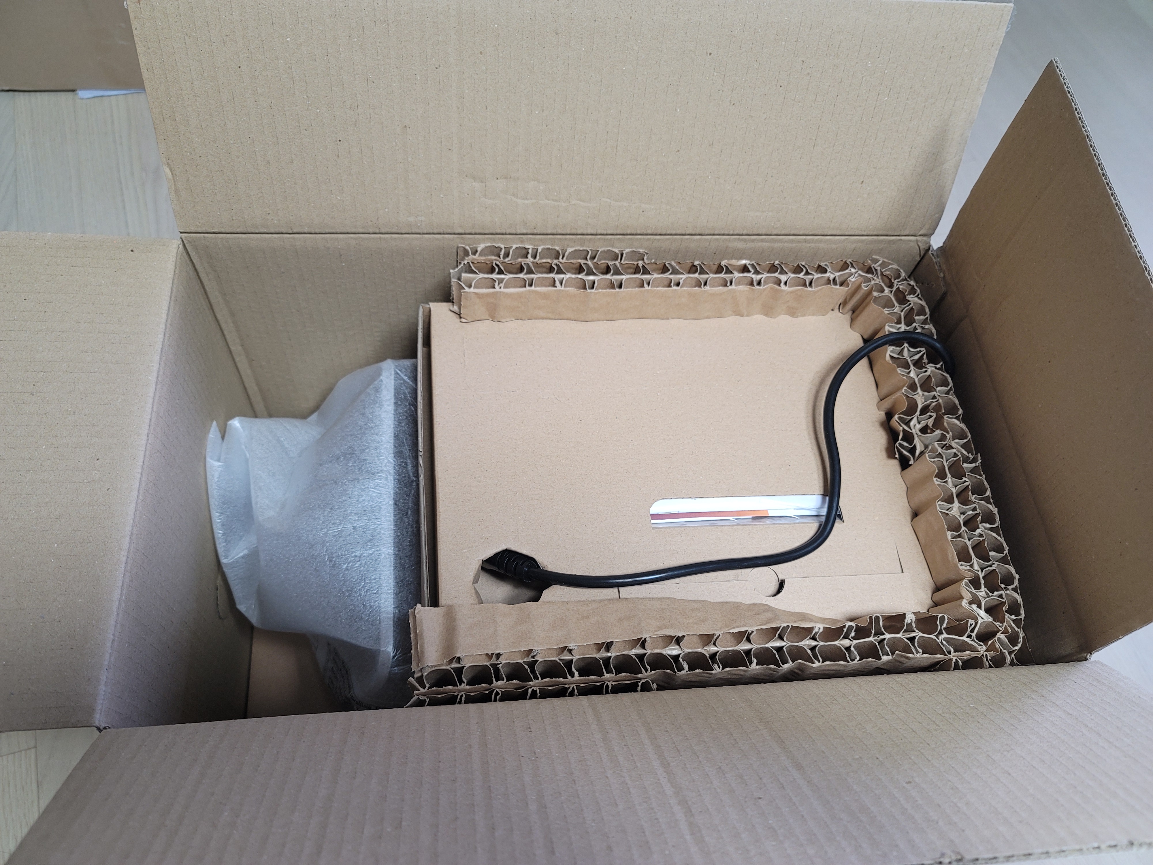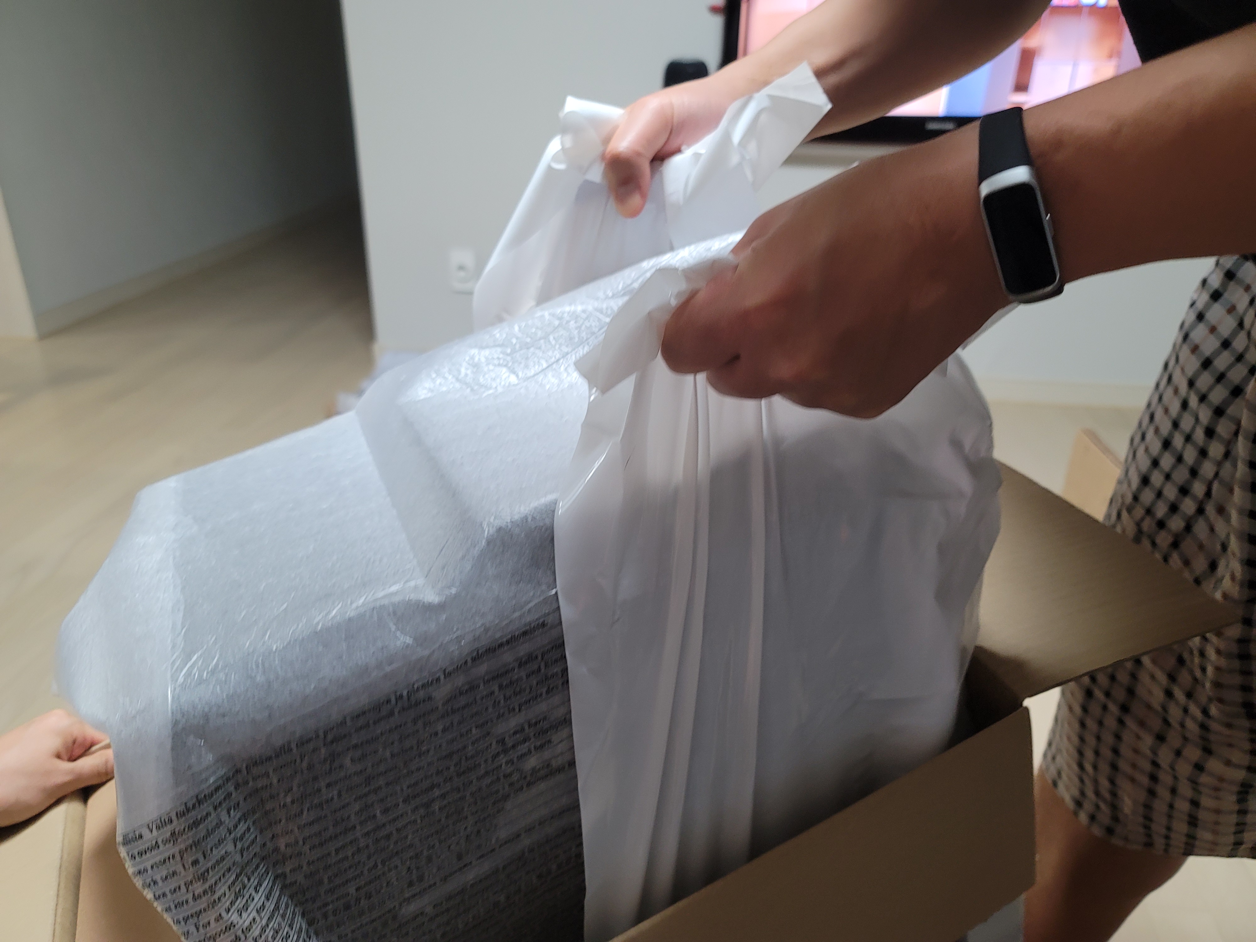 큰 박스에 와서 꺼내보니 안에 저렇게 커피머신 박스가 들어있어요. 열어보니 안쪽도 환경을 생각한 종이 완충재로 되어 있네요. 센스있게 안쪽 하얀 비닐 부분을 양쪽에서 들어서 올려 꺼낼 수 있도록 포장되어 있구요. 꺼냈더니 저렇게 커피머신이 짠하고 나옵니다.