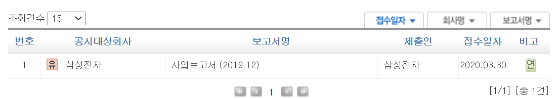 필터는 기본으로 6개월로 설정되어 있어서 작년 사업보고서만 검색이 되었습니다. '전체'를 선택하시면, 삼성전자가 설립되고 나서부터 현재까지 모든 사업보고서가 검색이 됩니다.