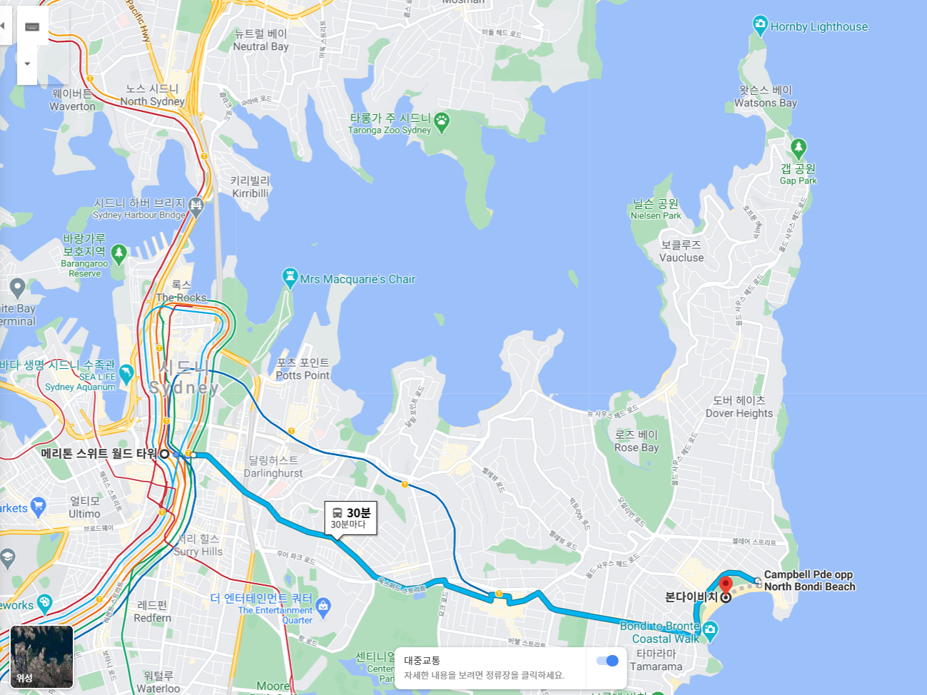 호텔에서 느린걸음으로 10분 정도 걸으면 Musium Station이 나오고 그 근처 버스 정류장에서 333번 버스를 타고 Bondi Beach까지 환승없이 쭉 갔습니다. 이런 경로로 이동했어요. 시간은 대략 40분 정도 걸린 것 같아요.