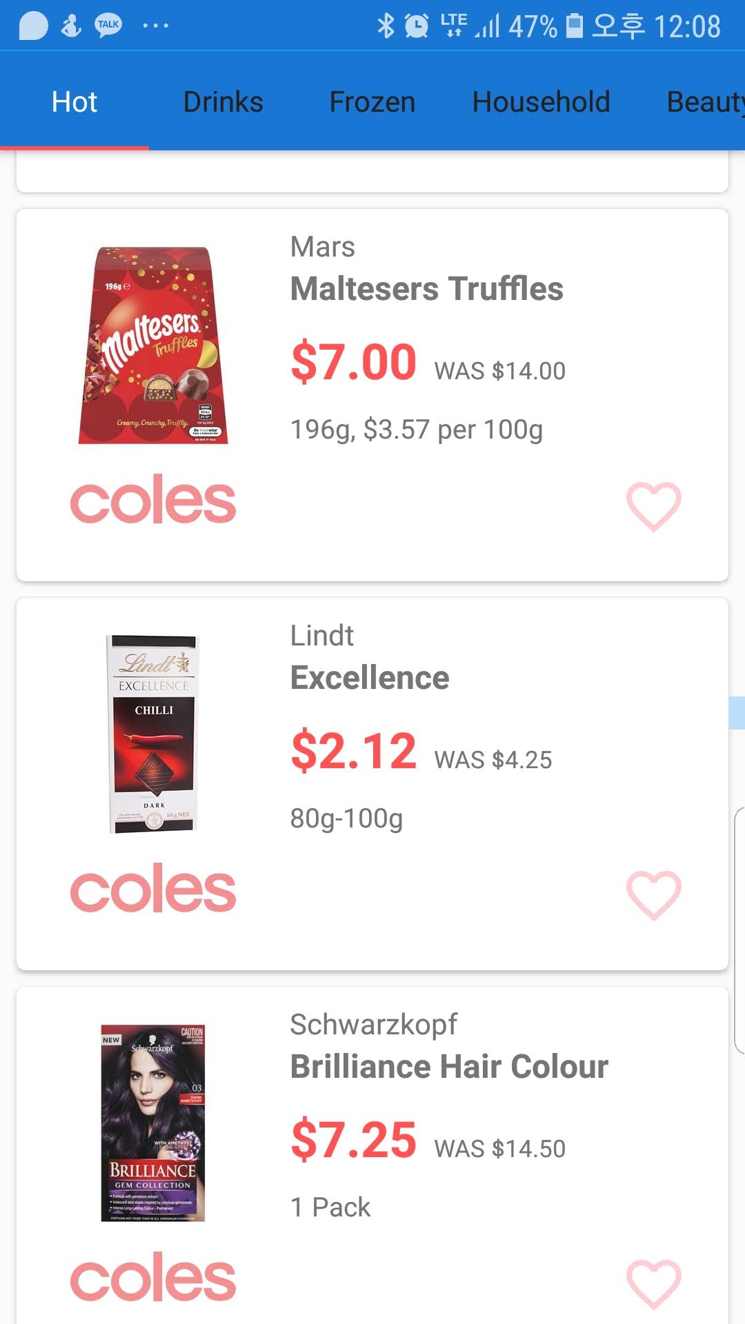 며칠 마트를 다니면서 알게 된 Half price 어플. 이 어플을 깔면 coles와 woolworths의 세일 품목을 알 수 있더라구요. 먹거리는 눈에 보이는 대로 사면 되지만 화장품이나 약같은 것은 비교해보고 사면 좋을 것 같아요. 심지어 약국보다 더 싼 품목도 있거든요. 마트 갈 때마다 가격을 대충 봐 두면 마지막에 쇼핑할 때 고민 덜 하고 살 수 있을 것 같아요.