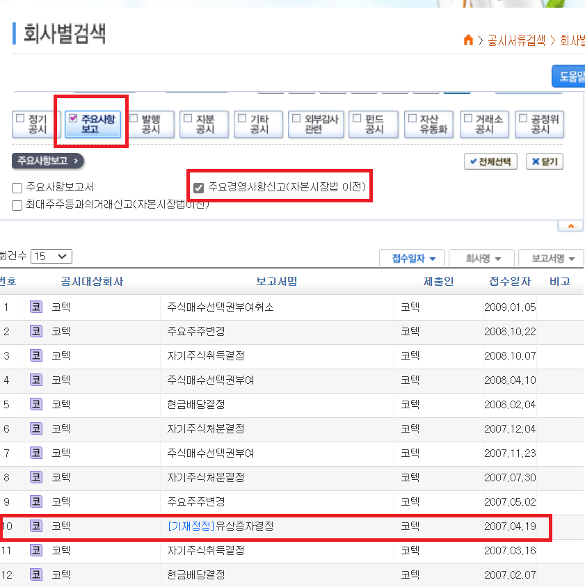 '회사별 검색' > '주요사항 보고' > '주요경영사항신고(자본시장법 이전)'을 선택하여 검색하면 유상증자 공시를 확인할 수 있습니다.